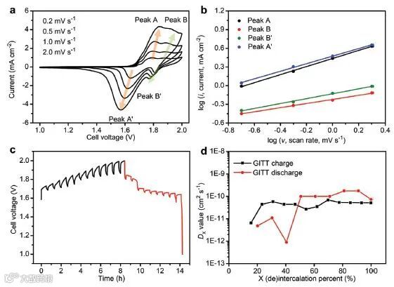 图3 在ZnCl2 · 0.03KBr · 2H2O电解质中石墨正极的电化学动力学评估:a) 在不同扫速下的CV曲线;b) 由图a)得到的log(i) vs log(v)曲线;c) 恒电流间歇滴定(GITT)的充放电曲线;d) 石墨电极中卤素的扩散系数(Dx)