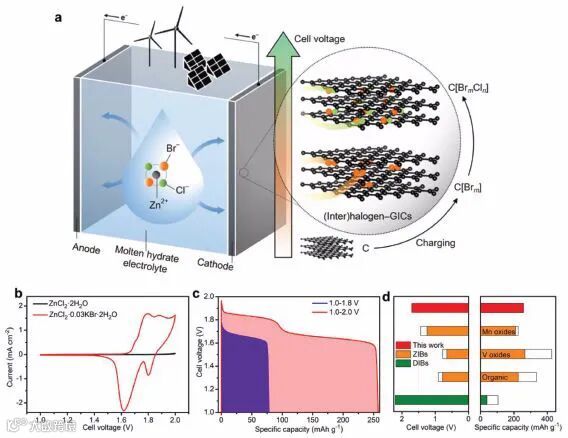 本文提出了一个概念性的双卤水系锌电池体系,采用熔融水合物作为电解质且在石墨正极使用Br0/Br-和Cl0/Cl-双氧化还原电对,其石墨插层化合物(GIC)结构可以提供高的放电容量,熔融水合物电解质可以提供潜在的高能量密度,为发展高效能源存储技术提供了新的可能。