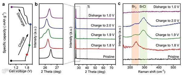 为了验证石墨电极充放电过程中的结构演变,作者通过XRD对不同状态下的石墨电极进行表征(图2a, b),图中XRD峰位的位移证实了在卤素嵌入过程中连续形成了石墨插层化合物(GICs)。当放电至1.0 V时,(002)晶面所对应的峰重新出现,这表明在卤素脱嵌后石墨的结构完整性得以保留。Raman光谱的结果也表明了卤素-GICs的形成。充电时,在240 cm-1处的峰对应于插层中Br2的伸缩振动,由于分子间Br-Br键的减弱以及石墨到插层间的电荷转移,其频率低于自由的Br2的Raman特征峰。进一步的充电后再300 cm-1处的峰对应于插层的BrCl伸缩振动,其频率同样低于自由的BrCl的Raman特征峰。放电后这些特征峰均消失说明了卤素插层的可逆性。