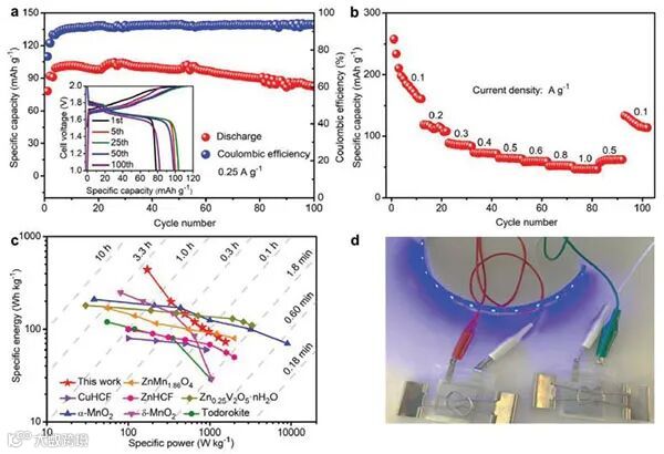 图4 采用ZnCl2 · 0.03KBr · 2H2O电解质的双卤锌电池的电化学性能:a) 电流密度为0.25 A g-1时的循环性能,插图为充放电曲线;b) 电流密度在0.1-1.0 A g-1时的倍率性能;c) 双卤锌电池与各种水系锌电池的性能比较:基于正极活性材料质量的Ragone曲线图;d) 两个双卤锌电池串联后的工作电压使得蓝色LED灯泡发光。