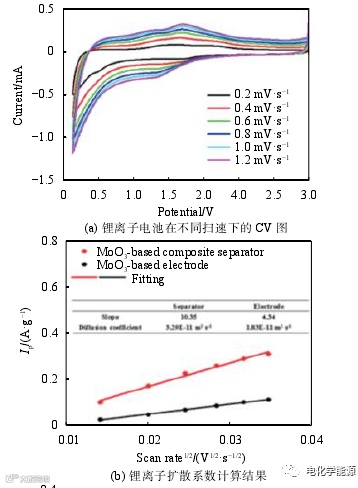 循环伏安测试除了对电极氧化还原反应进行分析以外,还可以进一步研究锂离子扩散系数和赝电容效应。图 2为基于氧化钼的复合隔膜的锂离子电池在不同扫描速度下的 CV曲线图,峰值电流 Ip,离子扩散系数D和扫描速度v存在以下关系式: