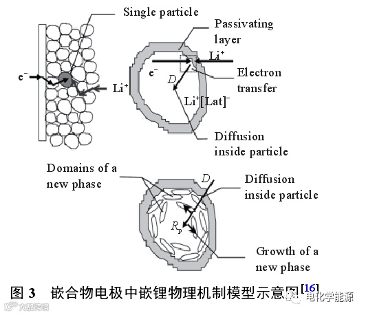 目前描述电化学嵌入反应机制的模型主要有吸附模型 (adsorption model) 和表面层模型 (surface layer model)。一般采用表面层模型来描述锂离子在嵌合物电极中的脱出和嵌入过程。表面层模型最初由Thomas等提出,分为高频、中频、低频区域,并逐步完善。Barsoukov基于锂离子在单个活性材料颗粒中嵌入和脱出过程的分析,给出了锂离子在嵌合物电极中嵌入和脱出过程的微观模型示意图(见图 3),认为锂离子在嵌合物电极中的脱出和嵌入过程包括以下步骤:1)电子通过活性材料颗粒间的输运、锂离子在活性材料颗粒空隙间的电解液中的输运;2)锂离子通过活性材料颗粒表面绝缘层(SEI膜)的扩散迁移;3)电子/离子导电结合处的电荷传输过程;4)锂离子在活性材料颗粒内部的固体扩散过程;5)锂离子在活性材料中的累积和消耗以及由此导致活性材料颗粒晶体结构的改变或新相的生成。