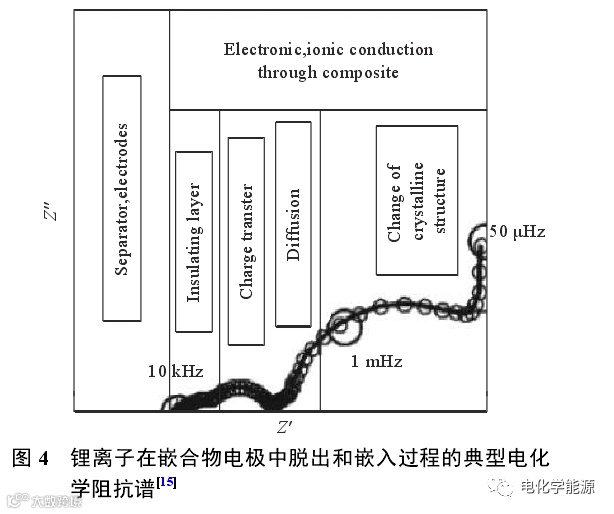 由于 EIS的频率范围一般为 10–2~105 Hz,另外锂电池的正极材料或负极材料在锂离子嵌入、脱出过程中体积变化较小,体相内部物理化学性质变化不大,且一般不存在剧烈的相变过程,新生成相和原始相之间的物理化学性质差别也往往不大,因此在 EIS谱中很难观察到极低频率区域,即与活性材料颗粒晶体结构的改变或者与新相生成相关的半圆。
