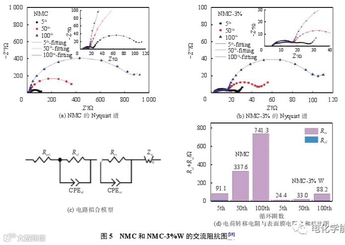 料进行表面改性,并利用 EIS验证其改性效果,图 5为 NMC 和 NMC-3%W的交流阻抗图,NMC和 NMC-3%W材料所测得的 Nyquist 谱由两个半圆组成。高频区与实轴的截距点对应溶液电阻 Rsol;中高频区第一个半圆对应表面膜电阻 Rsf,包括固体电解质膜(SEI)和表面包覆层;低频区的半圆对应的是电极/电解液界面的电荷转移电阻 Rct。随着循环的进行,Rsol基本保持不变;而 Rsf存在一个先减小后增大的过程,这与循环时 NMC 材料活化以及SEI形成过程有关;NMC的Rct在第5圈时为71.01 Ω,循环至第 50圈后增加到 328.50 Ω,而循环 100圈后增加到 731.00 Ω,这说明循环过程中正极材料与电解液界面受到破坏,界面电荷转移受阻。在包覆WO3后,NMC-3%W材料的 Rct明显减小,在 100圈时 Rct为 73.27 Ω,仅为 NMC材料的 1/10。这表明 W表面改性能有效抑制电解液对正极材料的破坏,提升界面稳定性,减少界面电荷转移电阻。在电池中,Rsf与 Rct的电阻之和是影响电池充放电性能的关键因素之一。如图 5(d)所示,在 W表面改性后,NMC-3%W材料的总电阻值明显较小。因此,材料的循环稳定性和倍率性能明显提高。