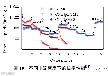 其中电荷转移数 n,电极面积 A和锂离子的摩尔浓度 C均为常数,所以 CV测试中峰值电流和扫描速度的平方根存在线性关系,斜率则可以定量反映扩散系数的大小,这一过程对应于锂离子在电极材料中的扩散,没有赝电容效应。如图 2(b)所示,斜率越大,锂离子扩散系数越大,表明基于氧化钼复合隔膜的锂离子电池的动力学性能更好,可以有效增强电池的倍率性能。