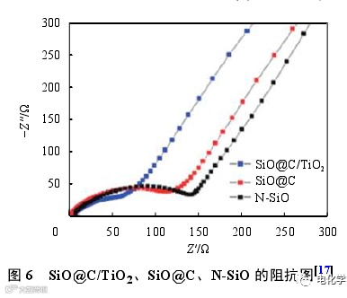对 SiO@C/TiO2、SiO@C、N-SiO 3种材料进行 EIS测试,绘制 Nyquist图(见图 6),可观察到 3种曲线具有相似的变化趋势,均由高频区的半圆以及低频区的倾斜直线组成。其中高频区的半圆代表 Li+通过活性颗粒表面 SEI膜的阻抗,低频区代表 Li+在活性颗粒内部的扩散阻抗,即 Warburg扩散阻抗。经拟合后,SiO@C/TiO2复合材料高频电阻为 3 Ω,低于 N-SiO的 8.2 Ω以及 SiO@C的 5.4 Ω。电化学阻抗谱 (EIS)测试阐明了 TiO2的加入对 SiO@C/TiO2复合材料电化学性能的影响。表明 TiO2涂层不仅提高了电化学动力学,而且提高了循环性能和初试电化学性能。