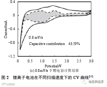 通过 CV测试图,还可以计算出赝电容效应对锂离子电池容量的贡献值,根据以下公式: