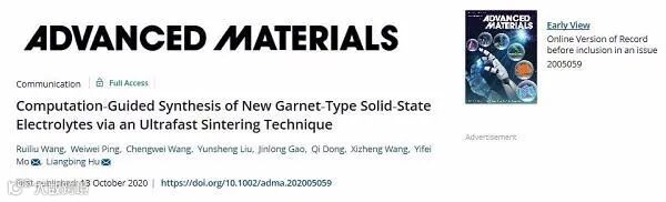 Computation‐Guided Synthesis of New Garnet‐Type Solid‐State Electrolytes via an Ultrafast Sintering Technique(Adv. Mater., 2020, DOI: 10.1002/adma.202005059)