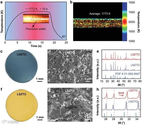 图2 超快烧结技术和LNZTO,LSZTO材料的形貌表征。(a)辐射加热温度分布曲线随时间的变化。嵌入图片展示了炭毡在烧结阶段的侧视数字图像,显示了均匀的温度分布。(b)红外摄像机测试的炭毡温度分布图。(c)烧结的LNZTO颗粒的照片。(d)烧结的LNZTO颗粒的横截面SEM图像,呈现出致密均匀的晶粒。(e)LNZTO和LSZTO的XRD谱图,其主峰均与立方石榴石相的标准衍射图相吻合。(f)烧结LSZTO颗粒的照片。(g)LSZTO球团的SEM横截面图像,显示出致密的晶粒结构和晶界上少量的第二相。(h)放大LNZTO和LSZTO颗粒在25°–35°的2θ范围内的XRD谱图,其中所有主峰都随着A位离子半径的减小而向更高角度移动。