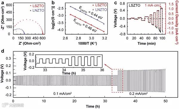 为了验证结构和性质之间的关系,作者测试了烧结的LNZTO和LSZTO的电化学性能。图3a显示在室温(30 ℃)下,LNZTO的离子电导率为2.3×10−4 s cm−1,比LSZTO(8.3×10−5 s cm−1)高3倍左右,该电导率值与常见石榴石型电解质的离子导电率值相当。与LSZTO相比,LNZTO的高导电性可能是由于其晶格参数大、立方相纯、晶界二次相较少等原因。根据Arrhenius方程计算,LNZTO和LSZTO的活化能分别为0.44和0.46 eV,该值与文献报告的其他石榴石型固态电解质结果相近(3b)。通过对称电池测试,LNZTO具有更好的界面稳定性和Li+传输性质(图3c,d)。