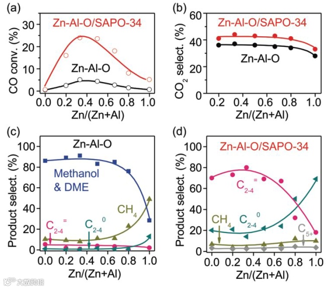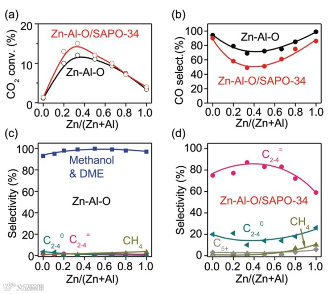具体而言,作者报告了一种CO和CO2在由尖晶石二元金属氧化物和SAPO-34组成的双功能催化剂上的加氢反应。ZnAl2O4/SAPO-34和ZnGa2O4/SAPO-34对CO和CO2合成低碳烯烃的反应具有很高的选择性。