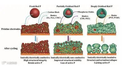 将活性材料与导电剂结合在一起的聚合物结合剂在维持磷负极结构完整性方面发挥了关键作用,在钠化/脱钠过程中其体积变化很大。