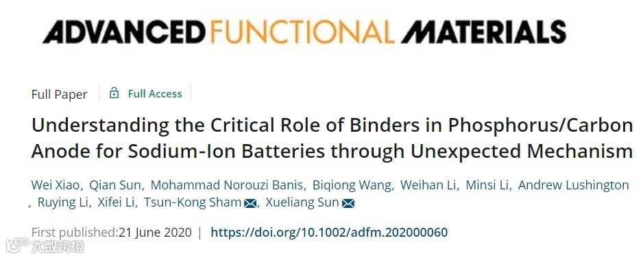 基于以上现状,加拿大安大略大学的孙学良和Tsun-Kong Sham教授等在国际知名期刊Advanced Functional Materials上发表题为“Understanding the Critical Role of Binders in Phosphorus/ Carbon Anode for Sodium-Ion Batteries through Unexpected Mechanism”的论文。Wei Xiao为本文第一作者。
