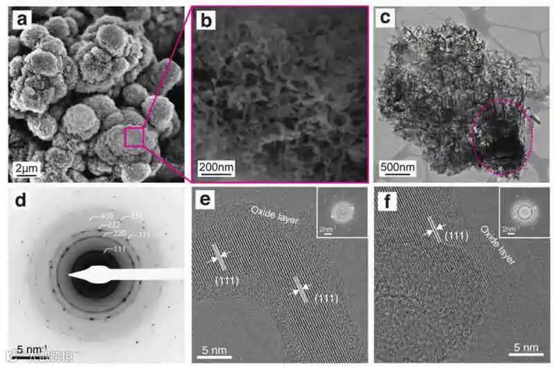 在20世纪60年代对碘化物过程的早期研究中,报道了SiI4热分解反应在780~1040 °C范围内可以观察到硅的生长。在前人研究的基础上,作者发现不同的热解温度对硅的形貌是否有不同的影响。在800-1100 °C温度下生产的硅颗粒的扫描电子显微镜(SEM)图像如图a,b所示。不同热解温度下硅颗粒形貌的变化趋势不同。在900 °C合成的硅颗粒显示出明显的结构,如图a所示,具有微尺度的球形,大小分布在1到6 µm之间,平均大小为2.7 µm。此外,在高倍率下,可以观察到扭结的硅纳米线(图b),它们发展成微团簇。作者认为,Si形貌的演变归因于从低反应温度到高反应温度的生长速率增加。要理解碘化物热解生长Si的机制,还需要进一步的研究。从随温度变化的形貌差异的扫描电镜观察,900 °C合成的硅颗粒形貌非常吸引人。为了得出关于SiNC粒子是如何组成的假设,作者进行了透射电子显微镜(TEM)以获得额外的原子信息。图c显示了单个SiNC粒子的TEM图像。这是因为团簇中有丰富的空隙,特别是在团簇的右下侧(用圆圈表示),可以看到粗大的树枝状晶体。结果表明,以一束粗大的树枝状硅晶体为核心,周围环绕着大量任意取向的扭结硅纳米线。对团簇在扭结区域和尖端的单个纳米线的高分辨率透射电子显微镜(HRTEM)分析如图e,f所示。
