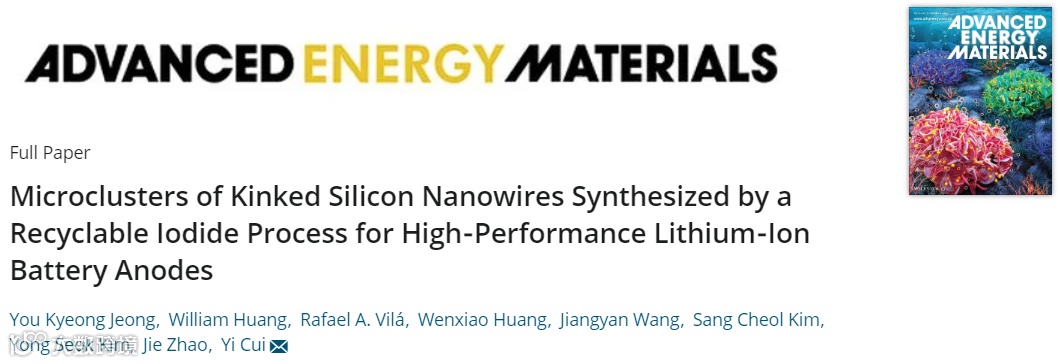 近日,斯坦福大学崔屹教授在材料研究顶级期刊Adv. Energy Mater.上发表了题为”Microclusters of Kinked Silicon Nanowires Synthesized by a Recyclable Iodide Process for High-Performance Lithium-Ion Battery Anodes”的研究性论文。在这里,作者开发了一种成本效益高的合成方法,它可以生成近乎理想的纳米结构硅的二次粒子团簇。由碘气和低品位硅微粒在操作过程中生成碘化硅。将碘化硅分解成结晶硅和碘气可以回收碘气,从而在接下来的循环中几乎完全再利用碘。通过可循环碘化物分解反应合成的硅的最佳纳米结构使其在1000次循环中保持83.6%的容量。