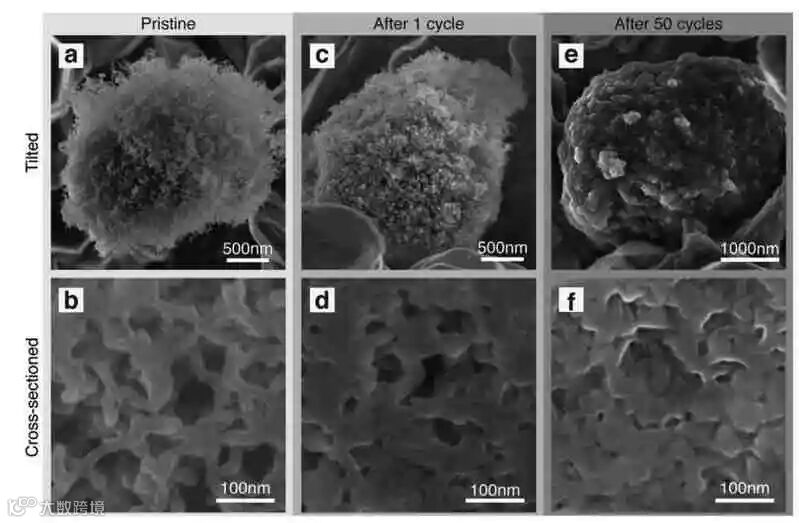 三维互连的硅纳米线结构显示出有效的电子传输,纳米线团簇中的空穴空间为锂离子的传输提供了通道。为了识别SiNC颗粒的结构稳定性,作者在循环前后对单个SiNC颗粒进行了聚焦离子束切割获得横截面。图a,b表示循环前原始SiNC颗粒的SEM图像。倾斜的SEM图像(图a)显示了由扭结的硅纳米线组装的SiNC颗粒的明确边缘。正如作者预期的那样,横截面的原始SiNC粒子的SEM图像显示出与空隙相互连接的纳米线(图b)。一般来说,在第一次循环后,晶态硅颗粒会崩塌其原始结构,因为晶态硅相在第一次锂化过程中转变为非晶态锂化硅,并在第一次脱锂后替换为非晶硅,导致其密度低于晶态硅。因此,第一次循环后观察SiNC颗粒的形貌变化是合理的,以验证SiNC颗粒的纳米结构的强度。图c,d显示了整个SiNC粒子及其在第一个循环后的横截面。图c显示了SiNC颗粒的表面略有肿胀,这归因于硅的相变和SEI层的生长,但在图d中,横截面的SiNC颗粒仍然保留了其初始的纳米线网络结构和空隙。