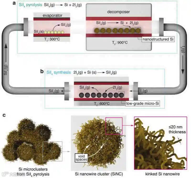 在这项工作中,作者首次提出了一种循环碘化工艺,该工艺不仅可以从低品位的硅微粒中制备出高质量的纳米结构硅,而且可以回收关键元素碘(I2)。图a,b显示了碘化工艺的循环性质,包括1)形成碘化硅(SiI4),2)将SiI4传输到分解室,3)SiI4热解形成纳米结构的硅微粒和碘气,以及4)回收的碘气与低品位的硅微粒反应生成新的SiI4。硅烷(SiH4)是合成元素硅的常用前驱体,通过复杂的催化剂再分配反应以低产率合成,而Si2气体与硅微粒在常压下高温(≈600°C)反应可以简单地合成SiI4,产率约为70%。SiI4气体可以在低压下生成元素硅和碘气体。