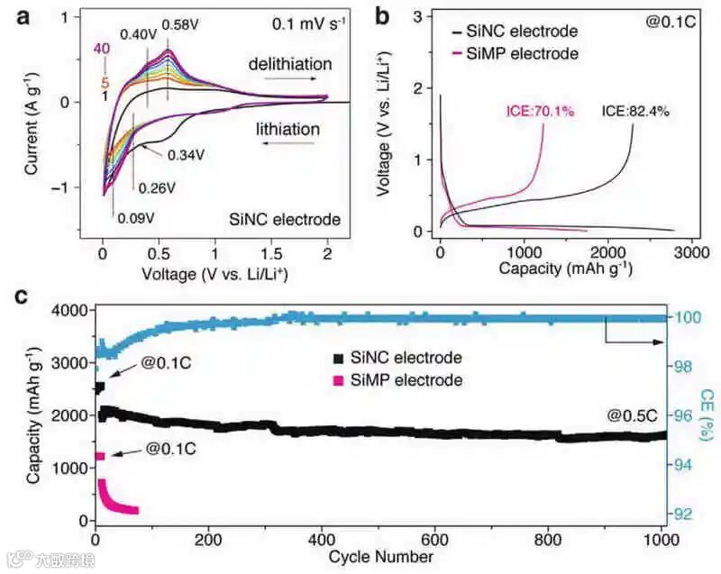 基于纳米线的Si电极表现出高度可逆的电化学反应。为了验证SiNC颗粒电化学还原/氧化反应的可逆性,作者用锂金属半电池方法对基于SiNC颗粒的电极进行了循环伏安测试。SiNC电极的循环伏安图如图a所示,它描绘了典型的硅锂化/脱锂电位。为了确认SiNC颗粒的比容量和可循环性,作者进行了恒电流电化学测量。图b显示了SiNC电极在低倍率(0.1C)下的初始电压分布(图b中的黑色曲线)。此外,作者还计算出每个电极的初始库仑效率(ICE)的差异。SiNC电极的可循环性如图c所示。对于两个硅电极,先以0.1 C倍率进行10个循环(10个预循环),然后以0.5 C倍率进行后续循环。SiNC电极(图c中的黑色)在1000次循环中表现出83.6%的出色容量保留率以及99.8%的平均库仑效率(CE)(图c中的蓝色)。