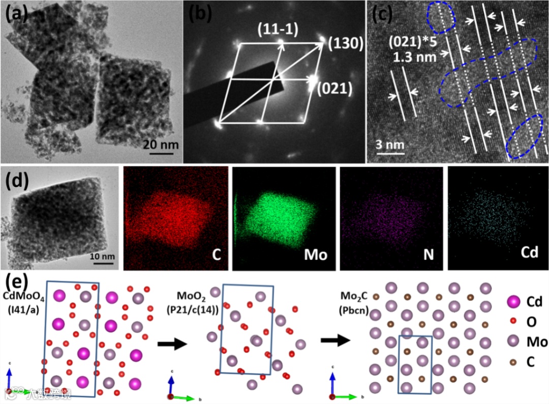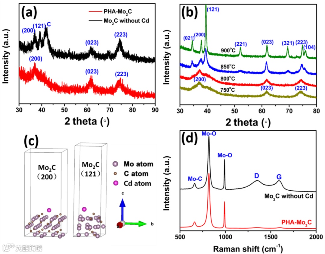 进一步对不同炭化温度样品的XRD结果显示,750oC和800oC合成的碳化钼只显示出(200), (023) 和 (223)晶面,而当温度升高到850oC和900oC时,一些新的衍射峰特别是(121)晶面凸显。由于900 degC,Cd完全升华,导致新(121)晶面出现,因此XRD结果可以证明Cd存在能够调控碳化钼晶面的生长。调控机理通过DFT理论计算证实。