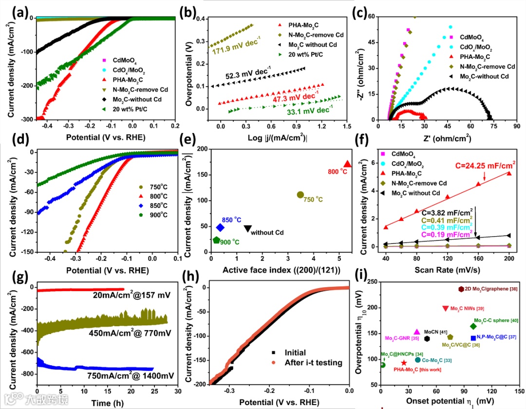 所获得的PHA-Mo2C表现出显着增强的HER活性,其相对于RHE的起始电位为-25 mV,Tafel斜率为47.3 mV/dec,在-10 mA/cm2的电流密度下,过电位为93 mV。另外,在酸性电解液中,PHA-Mo2C在大电流密度下也表现出出色的长期循环稳定性。这项工作为镉调控合成具有活性晶面调控和高电化学活性面积的高效碳化钼电催化剂提供了新的策略。