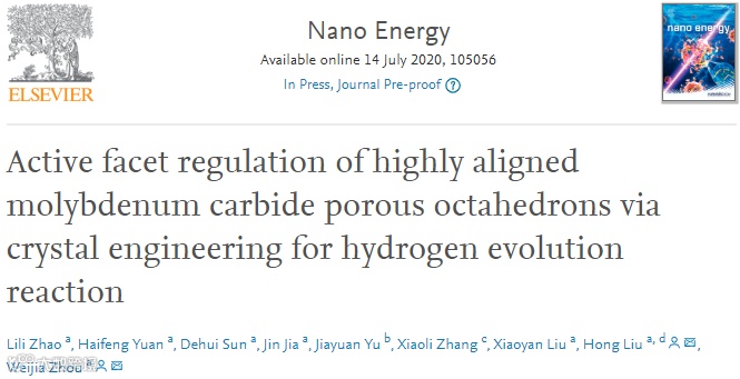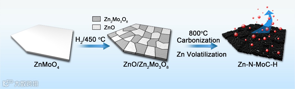 此后进一步发现了锌元素具有高温升华特性,合成钼酸锌纳米片,与双氰胺高温煅烧,一步实现了碳化钼纳米片合成、锌金属去除和钼催化位点显露,避免了两步刻蚀对碳化钼结构和催化活性的影响(Nanoscale, 2019, 11, 1700,第一作者:曹青,赵莉莉,通讯作者:周伟家,Yusuke Yamauchi,林健健)。