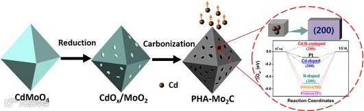 而在本工作中,作者以CdMoO4为模板和钼源,制备了多孔、高取向的镉氮共掺杂碳化钼八面体(PHA-Mo2C)。镉元素不仅具有和锌相似的升华特性,形成多孔碳化钼,暴露Mo活性位点;而且能够调控碳化钼的活性晶面。