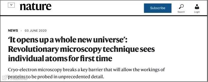 2020 年 6 月 3 日,Nature 在线发表了题为“它打开了一个全新的宇宙:革命性的显微镜技术首次看到了「单个原子」”的在线报道,浓墨重彩地介绍了冷冻电镜在分辨上的重大突破。