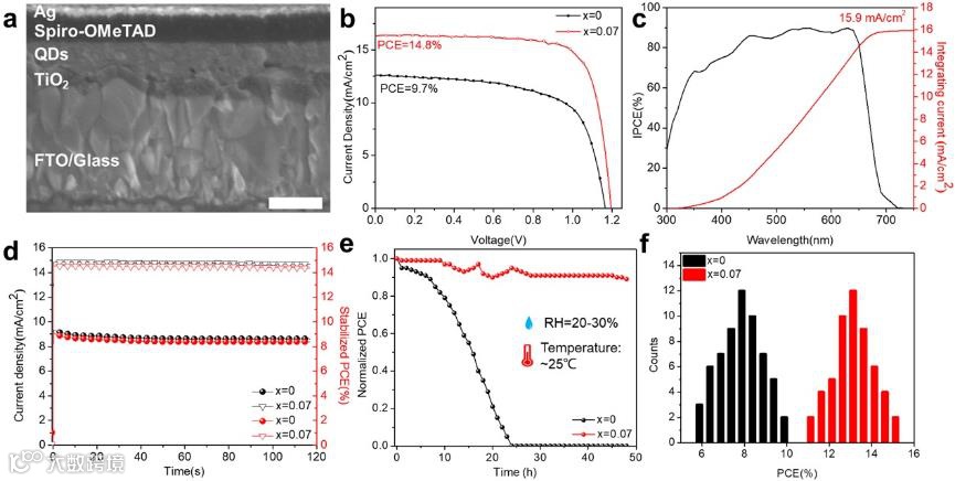 图4分析了基于协同处理前后的量子点太阳能电池器件的性能,发现在经过处理后,太阳能电池的效率和稳定性大大提高。