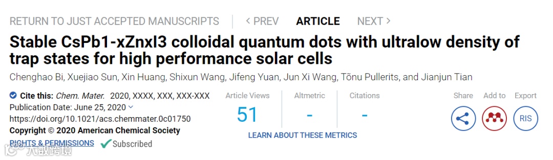 近日,北京科技大学田建军教授团队联合隆德大学Tonu Pellerits教授和中科院半导体所王军喜教授等团队在国际顶级期刊Chemistry of Materials上发表题为“Stable CsPb1-xZnxI3 colloidal quantum dots with ultralow density of trap states for high performance solar cells”的研究工作。
