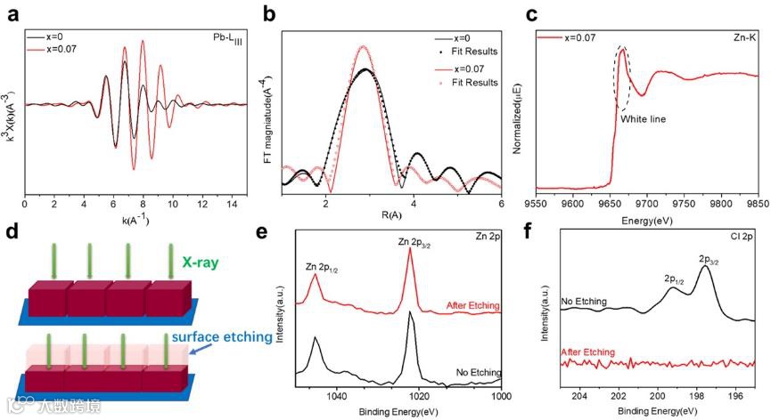 图2a,b显示了掺杂前后QDs的EXAFS光谱,可以发现,掺杂后的QDs表现了一个更对称的峰,并且峰强更强,证明Zn掺杂后晶格局部有序性提高,最大可能是由于八面体畸变的减少。此外,图2c表明,9690eV处的Zn的XANE白边峰显示了一个典型的八面体配位的特征,证明Zn确实存在于CsPbI3 QDs的晶格的八面体中。