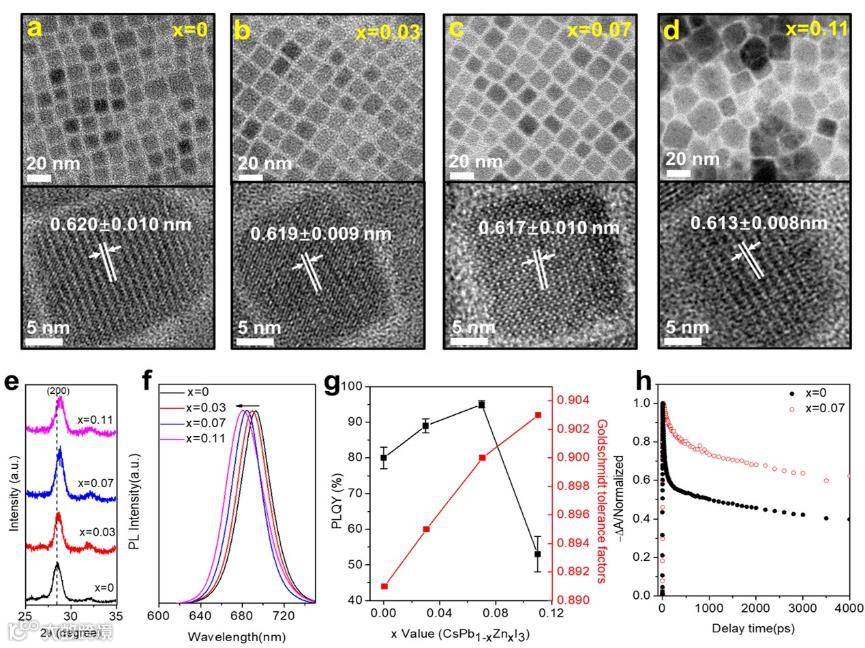 图1. CsPb1-xZnxI3 QDs的微观结构和光学性能表征