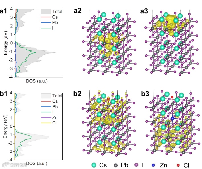 图3基于DFT理论计算表明,Zn2+掺杂和Cl-钝化后协同作用后改善了态密度和电荷密度分布,实现导带和价带中态密度和电荷密度实现非定域化的均匀分布。