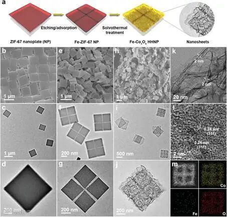 本文报道了一系列由13种不同金属原子掺杂的超薄Co3O4纳米片组成的多级中空纳米板的合成。