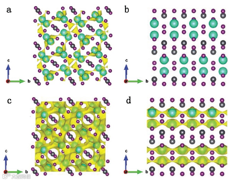 Cs4PbI6和δ-CsPbI3在等势能面E(Cs) =1.26 eV(a,b)和 E(Cs) =5.50 eV(b, d)时离子迁移路径。