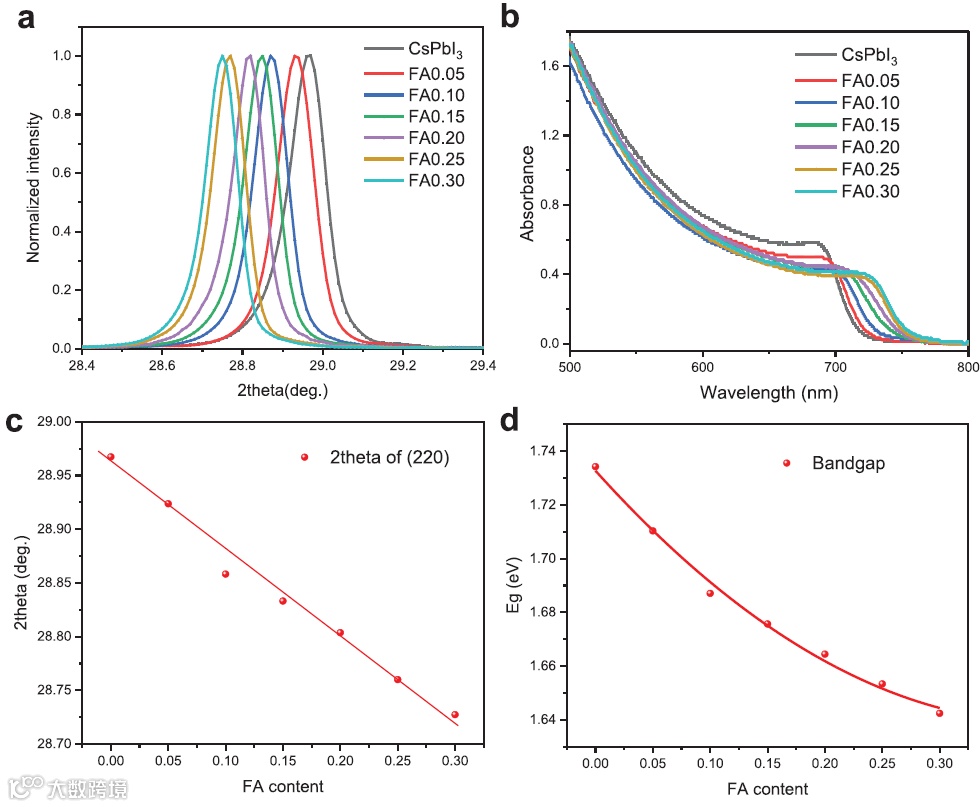 (c)FAxCs1-xPbI3钙钛矿(x = 0、0.05、0.10、0.15、0.20、0.25、0.30)的(220)峰位和
