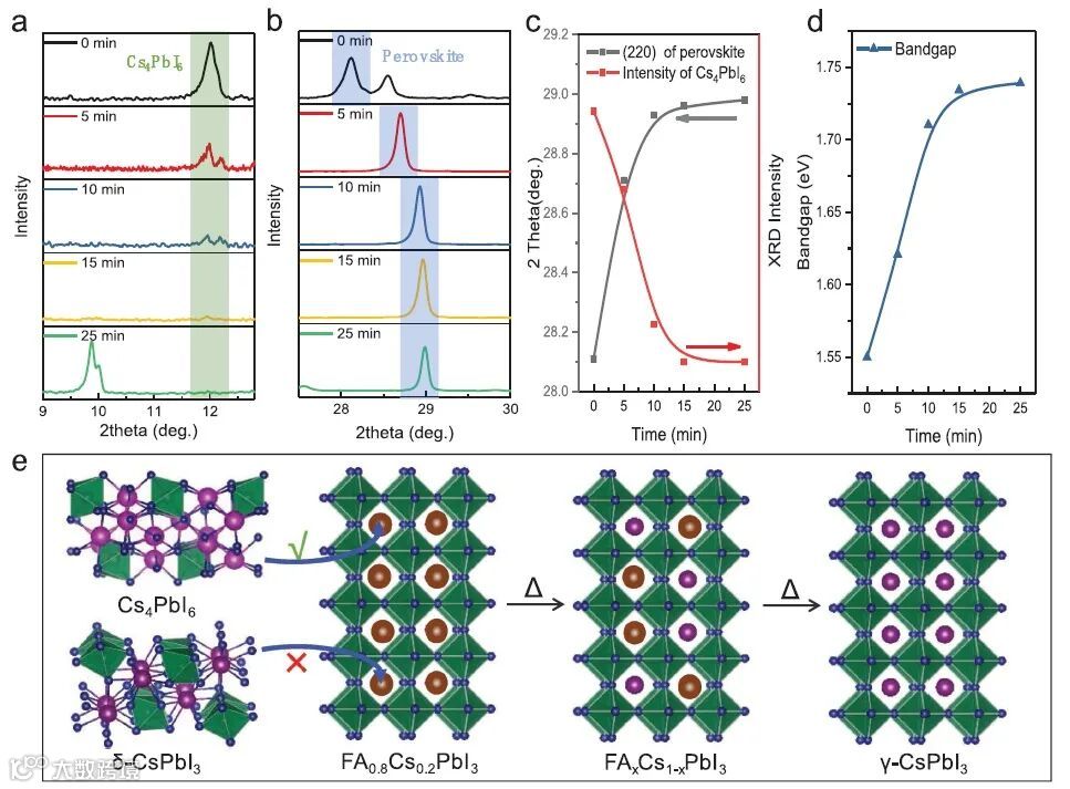 图1示例了在热退火过程中Cs4PbI6中间相与钙钛矿相阳离子交换过程。随退火过程进行,Cs4PbI6中间相峰强不断降低,混合钙钛矿相峰位持续向高衍射角偏移。
