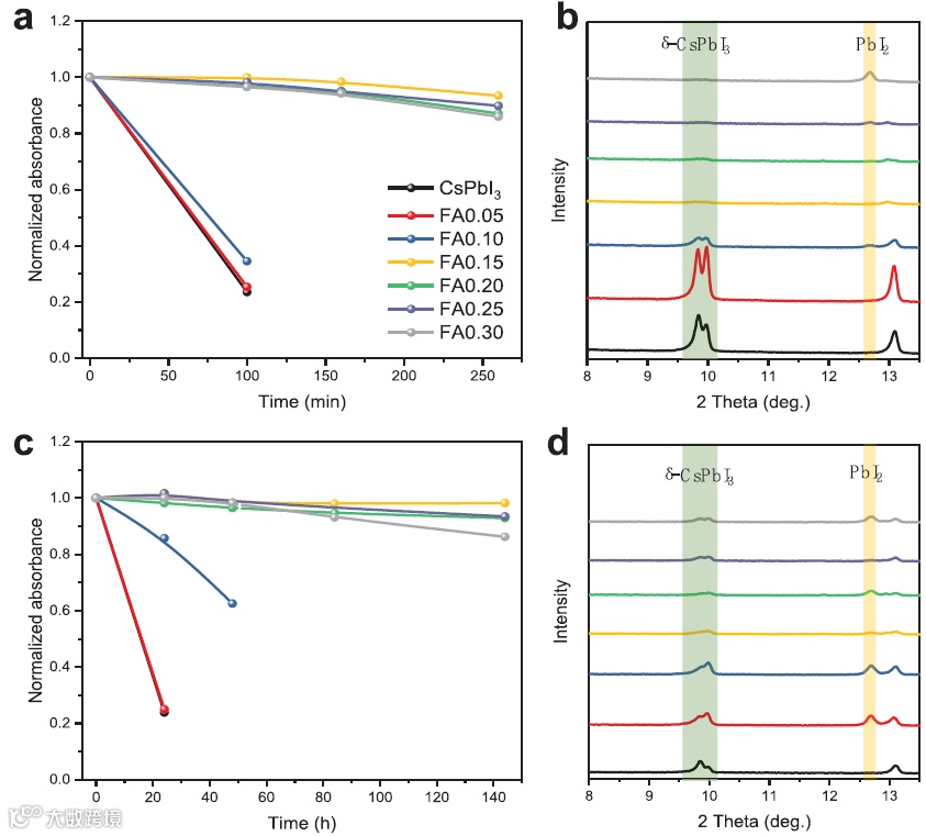 对该FAxCs1-xPbI3钙钛矿材料湿热稳定性的研究结果与紫外光照稳定性相一致。FA含量低于15 mol%的薄膜会迅速分解。XRD图表明(图4d),FA+低于15 mol%和高于25 mol%时,薄膜所发生的分解来自于不同的原因。前者主要是发生了δ-CsPbI3相析出,而后者主要是形成了PbI2。