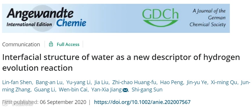 近日,厦门大学姜艳霞教授等合作。在国际顶级期刊ANGEWANDTE CHEMIE-INTERNATIONAL EDITION (影响因子:12.959) 上发表题为“Interfacial structure of water as a new descriptor of hydrogen evolution reaction”的研究工作。