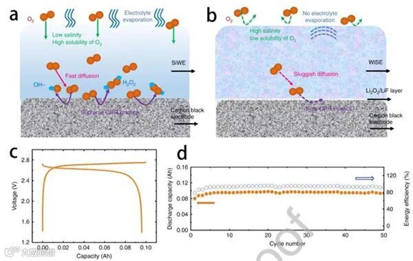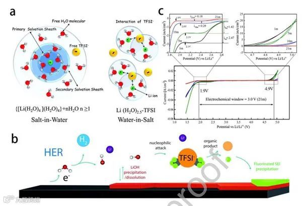 在进一步研究SEI的形成机制后,Grimaud等人证实了基于LiTFSI的WiSE中的水首先被还原。水的还原产生具有高反应性的OH-,这可以催化TFSI-的降解并伴随着亲核攻击,形成氟化产物组成的钝化SEI,如LiF,这有助于防止电解质的进一步分解 (图2b)。因此,鉴于这些优点,WiSE在提高水性可充电电池的能量密度方面有着巨大的前景。