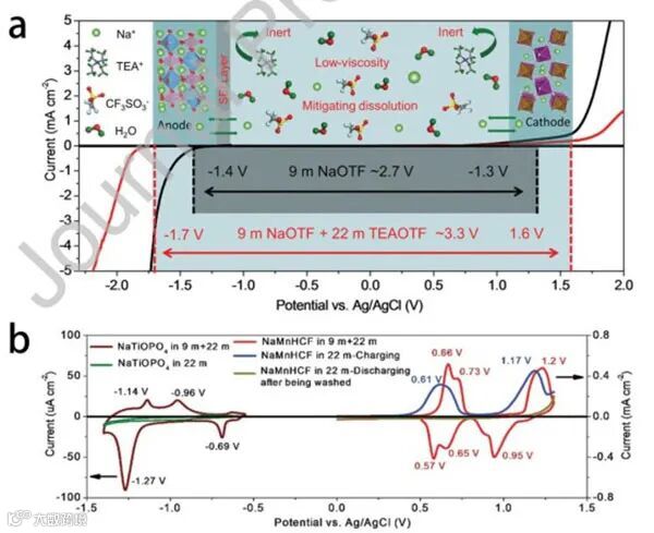 图9.(a)在铝网和钛网作为正负极的三电极电池中,用CV在10 mV s-1下测量了9 m NaOTF电解液和WiBS电解液(9 m NaOTF+22 m TEAOTF)的ESW。(b)在22 m TEAOTF和WiBS电解液(9 m NaOTF+22 m TEAOTF)中,NaTiOPO4负极和NaMnHCF正极在1 mV s-1时的CV曲线。