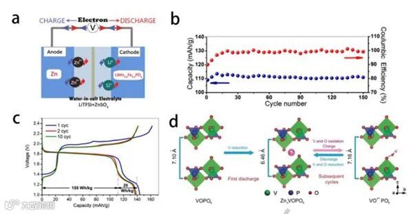 图10.(a)Zn/LiMn0.8Fe0.2PO4电池示意图。(b)Zn/LiMn0.8Fe0.2PO4全电池在0.3 C下的循环稳定性。(C)Zn/LiMn0.8Fe0.2PO4全电池在0.1 C下的典型电压分布。(d)循环过程中氧和钒的氧化还原机理示意图。