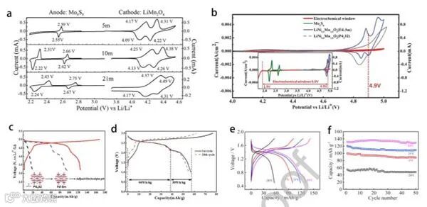 图6. (a) 在不同LiTFSI浓度下,在0.1 mV s-1的LiMn2O4和Mo6S8电极上用CV测量水系电解质的ESW。(b) 在10 mV s-1的非活性不锈钢电极上测量了WiSE的ESW,并在0.1 mV s-1的WiSE中测量了Mo6S8和不同结构的LiNi0.5Mn1.5O4的锂/脱硫电位。(c) 以LiTi2(PO4)3为负极,在0.5°C的pH调整的WiSE中,Fd-3m LiNi0.5Mn1.5O4的充放电曲线。(d) LiNi0.5Mn1.5O4/Mo6S8电池在0.5°C下的充放电曲线 (e) LiVOPO4/VO2电池在50 mA g-1下的典型电压分布;(f) LiVOPO4/VO2电池在-20、-5、25和80°C温度下在50 mA g-1下的循环稳定性。