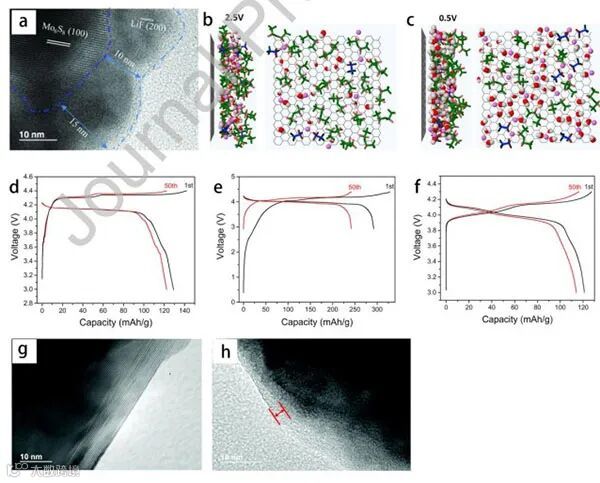 图8.(a)Mo6S8在21 m LiTFSI中循环后的透射电镜(TEM)图像。(b–c)在2.5 V(b)和0.5 V(c)vs.RHE下,WiBS电解液(21 m LiTFSI+7 m LiOTF)中电极表面内Helmholtz界面层的快照。(d–f)LiPO4F/Li金属(d)、LiPO4F/石墨(e)和LiMn2O4/Li金属(f)在0.3 C下的典型电压曲线(g–h)分别是在21 m LiTFSI-0.1 wt% TMSB电解液中循环后的原始LiCoO2粉末和LiCoO2的TEM图像。