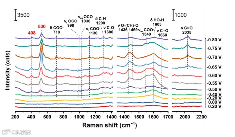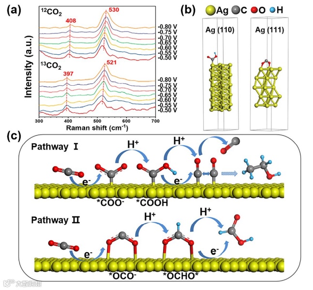 通过原位SERS监测CO2ER过程并结合13C/12C同位素交换和DFT计算获得了初步中间体*COOH和*OCO-的直接光谱证据,这些中间体分别由通过碳原子和两个氧原子与表面配位的CO2直接还原而形成。