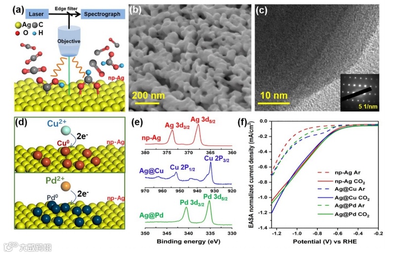 该工作通过原位表面增强拉曼光谱(in situ SERS)结合13C/12C同位素交换实验用于探测纳米多孔银(np-Ag)上的CO2ER过程。初步中间体*COOH和*OCO-的直接光谱证据表明,CO2通过多种吸附模式与催化剂配位。此外,上述中间体的相对拉曼强度在被Cu或Pd改性的np-Ag上显著变化,并且液相产物的选择性也相应地变化。结合密度泛函理论计算,这项研究表明,CO2吸附构型是控制反应选择性的关键因素。同时,*COOH和*OCO-是初始反应阶段调节液相产物选择性的关键靶点,这可能有助于将来选择性催化剂的设计。