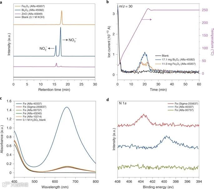 在商业金属铁中意外的发现氮化物杂质。金属铁是工业生产纳米Fe2O3的前体,也是非均质N2固定的基准催化剂。研究者通过将五种商业铁产品溶解在0.1 M H2SO4(硝化氮被水解成NH4+)中,谨慎地检测了氮杂质,然后通过成熟的靛酚蓝比色法测定得到的溶液中NH4+的浓度。如图2c等所示,在所有五种铁样品溶液中都观察到了NH4+-N,可能来自氮化物。