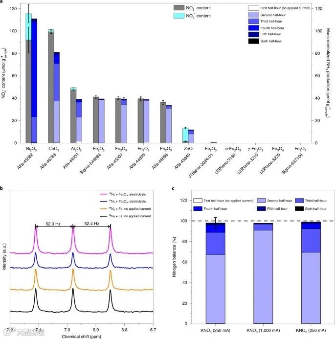 H2O-NaOH-KOH系统案例分析。 研究者首先在含有40 wt%的水和等摩尔NaOH和KOH的H2O NaOH电解液中进行电解,温度为200℃,负载Fe2O3(Alfa Aesar no. 45007)催化剂。在恒定施加电流250 mA下,催化剂的总质量归一化铵生成量为39.2±1.3 ,非常接近HPLC测定的Alfa Aesar-45007中NO3−杂质的含量(563±21 ppm-N,相当于40.2±1.5 ),对应的总氮匹配平均为97.5%(图3a)。