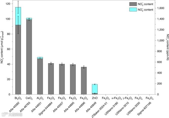 此文中,鉴于金属氧化物和金属铁在不同NRR体系中制备催化材料中的频繁使用,研究者选择了一组材料作为分析的重点。研究者对其产品中含氮杂质的含量进行了仔细的检测。令人惊讶的是,在一些商业氧化物中检测到高水平的NO3-和NO2-离子(例如,在一个商业Bi2O3样品中,总NOx--N的含量为1,610±48 ppm),而在一个商业铁中,氮化物-N的含量高达7,297±99 ppm。