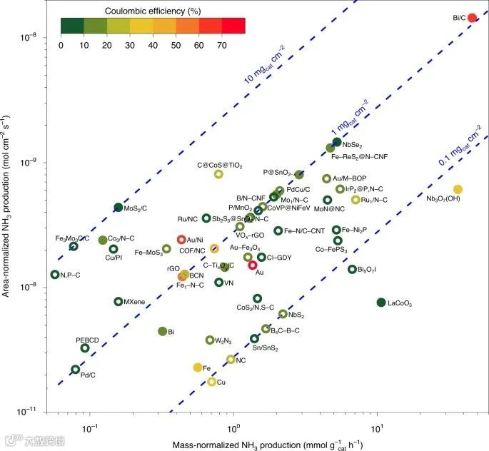 此外,研究者还建议报告(催化剂)质量标准化NH3生产,以及区域标准化NH3生产,以备将来研究之用。图4比较了铵电合成中报告的催化剂的质量和面积归一化铵产量。区域标准化NH3产量范围为三个数量级(从2×10−11到2×10−8 mol cm−2 s−1),质量标准化NH3产量范围为0.05到50 mmol g−1 h−1);然而,区域标准化NH3生产并不总是与大规模标准化NH3生产一致。此外,报告质量标准化的NH3生产可能有助于比较不同方法的N2固定,以合理定位和评价体系的催化活性。