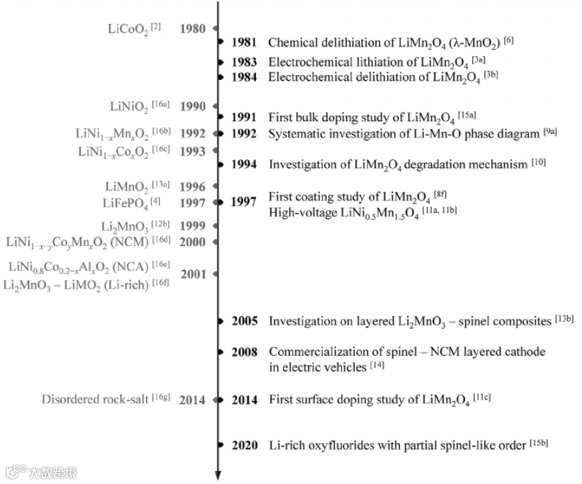 在对Fe3O4尖晶石电化学锂化的早期研究之后,Thackeray等人,1983年和1984年分别报道了LiMn2O4尖晶石的电化学锂化和脱锂反应,引起了人们对这类热稳定性好的正极的研究兴趣。尽管与后来开发的层状LiNi1-x-y Cox Mny O2(NCM)、LiNi1-x-y Cox Aly O2(NCA)、富Li/Mn正极和LiCoO2相比,LiMn2O4的容量和能量密度更小,但它是经济、无毒的,而且环境友好(无钴,含丰富无毒锰)且具有更坚固的晶体结构和快速扩散动力学,因此通常与层状正极混合以降低成本,提高结构和热稳定性,并提高速率性能。